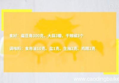 发布时间: 13小时前步骤1食材:扁豆角300克、大蒜3瓣、干辣椒3个 。调味料:食用油10克、盐1克、生抽2克、鸡精2克 。步骤2扁豆角去筋 。步骤3大蒜切碎,干辣椒切断 。步骤4热锅倒油,油温4成热时,下大蒜、倒入扁豆角,煸炒至微焦 。步骤5下干辣椒,炒香...
