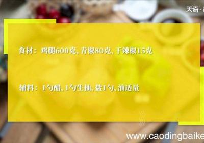 发布时间: 12小时前步骤1食材:鸡腿600克、青椒80克、干辣椒15克 。辅料 :1勺醋、1勺生抽、盐1勺、油适量 。步骤2鸡腿洗净后去骨切丁 。步骤3青椒去蒂去籽切丁 。步骤4干辣椒切段 。步骤5热锅倒油,下入鸡腿肉、干辣椒、调入1勺醋、1勺生抽、盐、炒匀...
