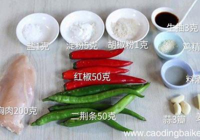 发布时间: 11小时前步骤1准备食材:二荆条50克、红椒50克、鸡胸肉200克、姜1块、蒜3瓣、盐1克、鸡精1克、胡椒粉1克、料酒5克、生抽3克、淀粉5克 。步骤2鸡胸肉洗净切丁 。步骤3放入料酒5克、生抽5克、盐1克、胡椒粉1克,再放入淀粉5克搅拌均匀,腌制1...