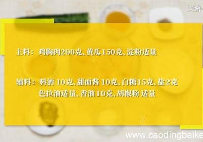 发布时间: 11小时前步骤1准备食材:鸡胸肉200克、黄瓜150克、料酒10克、甜面酱10克、白糖15克、盐2克、香油10克、淀粉适量、胡椒粉适量、色拉油适量。步骤2料酒,甜面酱,砂糖,盐,兑在一起成酱汁备用 。步骤3将鸡胸肉切成0.8厘米见方的丁 。步骤4黄瓜...