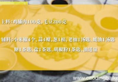发布时间: 11小时前步骤1主料:鸡脯肉100克、毛豆200克 。辅料:小米椒4个、蒜4瓣、葱1根、老抽1汤匙、蚝油1汤匙、糖1茶匙、盐1茶匙、胡椒粉1茶匙、油适量 。步骤2小米椒切圈 。步骤3蒜切末 。步骤4葱切成葱花 。步骤5鸡脯肉切丁 。步骤6【辣炒毛豆鸡...