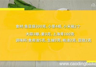 步骤1食材:鱼豆腐300克、小葱4根、小米椒2个、大蒜3瓣、姜3克、上海青100克 。调味料:食用油5克、生抽3克、蚝油2克、豆豉2克 。步骤2上海青对半切开,放入沸水锅中,焯烫30秒,捞出备用 。步骤3鱼豆腐对半切开 。步骤4小葱切段 。...