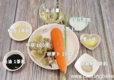 发布时间: 14小时前步骤1准备食材:胡萝卜200克、牛杂100克、油适量、盐1茶匙、姜1块、小葱1根、胡椒粉1茶匙、料酒1茶匙、蚝油1茶匙 。步骤2胡萝卜洗净切块 。步骤3牛杂洗净改刀成小片 。步骤4姜切片 。步骤5小葱切葱花 。步骤6起锅倒油,油热加入姜炒香...