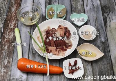 发布时间: 14小时前步骤1准备食材:牛杂200克、胡萝卜50克、油适量、盐1茶匙、白胡椒粉1茶匙、姜1块、大葱1段、小葱1根、干辣椒5克、香叶5克 。步骤2胡萝卜去皮切小块 。步骤3大葱切段 。步骤4姜切片 。步骤5小葱切葱花 。步骤6干辣椒切段 。步骤7首先...