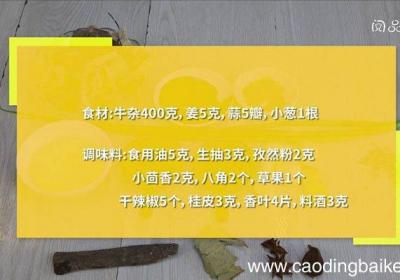 步骤1食材:牛杂400克,姜5克,蒜5瓣,小葱1根 。调味料:食用油5克,生抽3克,孜然粉2克,小茴香2克,八角2个,草果1个,干辣椒5个,桂皮3克,香叶4片,料酒3克 。步骤2牛杂放入冷水锅中,加入料酒,大火煮沸后,继续煮30分钟,捞出...