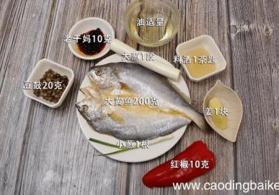 发布时间: 1天前步骤1准备食材:大黄鱼200克、豆鼓20克、油适量、老干妈10克、料酒1茶匙、姜1块、小葱1根、大葱1段、红椒10克 。步骤2大黄鱼洗净打上花刀 。步骤3红椒切丝 。步骤4姜切丝 。步骤5小葱切葱花 。步骤6大葱切丝 。步骤7首先盘内放入黄...