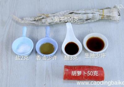 发布时间: 14小时前步骤1准备食材:笋干100克、胡萝卜50克、盐2克、生抽少许、醋3克、香油少许 。步骤2笋干洗净,用温水提前泡发 。步骤3洗净后切成条状 。步骤4胡萝卜洗净切丝 。步骤5锅中烧好水,将切好的笋干和胡萝卜一起倒入锅中焯水3分钟 。步骤6将焯好...