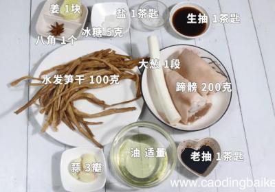 发布时间: 14小时前步骤1准备工作:蹄髈200克、水发笋干100克、大葱1段、姜1块、蒜3瓣、冰糖5克、生抽1茶匙、老抽1茶匙、盐1茶匙、八角1个、油适量 。步骤2蹄髈剁成小块洗净备用 。步骤3笋干洗净切段 。步骤4大葱切段 。步骤5姜切片 。步骤6蒜切片 。...