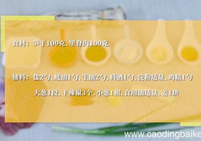 发布时间: 14小时前步骤1食材:笋干100克、里脊肉100克 。辅料:盐2勺、蚝油1勺、生抽2勺、料酒1勺、淀粉适量、鸡精1勺、大葱1段、干辣椒3个、小葱1根、食用油适量、姜1块 。步骤2提前将笋干泡发,然后捞出沥干水分 。步骤3切成细丝备用 。步骤4里脊肉切...