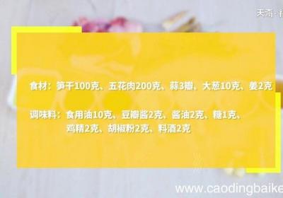 发布时间: 14小时前步骤1食材:笋干100克,五花肉200克,蒜3瓣,大葱10克,姜2克调味料:食用油10克,豆瓣酱2克,酱油2克,糖1克,鸡精2克,胡椒粉2克,料酒2克步骤2笋干用清水浸泡30分钟,切片,五花肉切片,蒜对半切开,大葱切片,姜切片 。【笋干炒肉...