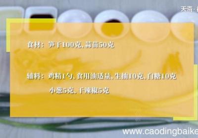 发布时间: 14小时前步骤1准备食材:笋干100g、蒜苗50克、鸡精1勺、食用油适量、生抽10克、白糖10克、小葱5克、干辣椒5克 。步骤2笋干提前用水泡发,然后捞出沥干水分,切成小块 。步骤3蒜苗切段 。步骤4小葱切段 。步骤5干辣椒切小段 。步骤6锅里放油,...