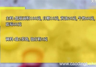 步骤1所需食材:低筋面粉100克,白糖10克,黄油20克,牛奶60克,蓝莓60克 。所需调料:盐2茶匙,泡打粉3克 。步骤2低粉、泡打粉依次过筛,加入白糖、盐、黄油揉搓成粗粒状 。步骤3加入冻蓝莓,牛奶拌匀 。步骤4用勺子辅助整形,放入烤盘...