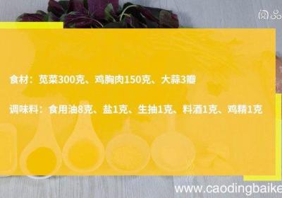 发布时间: 13小时前步骤1食材:苋菜300克、鸡胸肉150克,大蒜3瓣 。调味料:食用油8克、盐1克、生抽1克、料酒1克、鸡精1克 。【鸡丝苋菜的做法 鸡丝苋菜怎么做】步骤2苋菜洗净,沥干水分,切段 。步骤3锅中水沸后,加入料酒、鸡胸肉,煮10分钟,捞出,撕成...