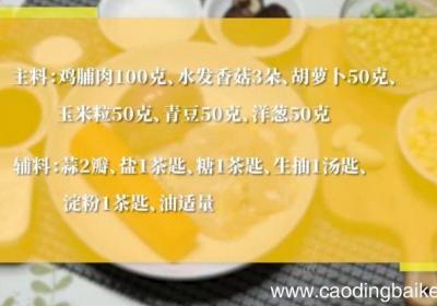 发布时间: 13小时前步骤1主料:鸡脯肉100克、水发香菇3朵、胡萝卜50克、玉米粒50克、青豆50克、洋葱50克 。辅料:蒜2瓣、盐1茶匙、糖1茶匙、生抽1汤匙、淀粉1茶匙、油适量 。步骤2蒜切末 。步骤3胡萝卜切小丁 。步骤4香菇切小丁 。步骤5洋葱切小丁...