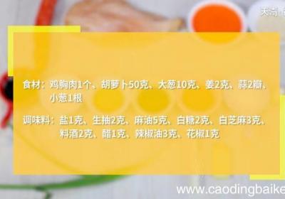 步骤1食材:鸡胸肉1个、胡萝卜50克、大葱10克、姜2克、蒜2瓣、小葱1根调味料:盐1克、生抽2克、麻油5克、白糖2克、白芝麻3克、料酒2克、醋1克、辣椒油3克、花椒1克步骤2胡萝卜切丝 。步骤3大葱切段 。步骤4姜切末 。步骤5蒜切末 。...