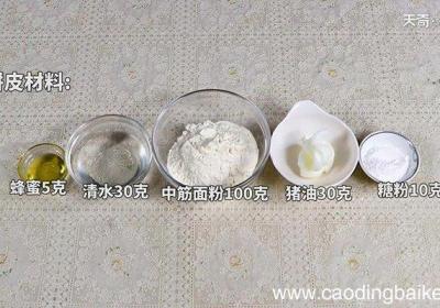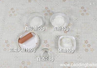 步骤1饼皮材料:中筋面粉100克、糖粉10克、蜂蜜5克、猪油30克、清水30克 。步骤2内馅材料:低筋面粉40克、火腿100克、糖粉30克、猪油20克、白糖20克、蜂蜜40克 。步骤3炒锅加热,倒入低筋面粉,用小火翻炒,至颜色微黄即可 。步...