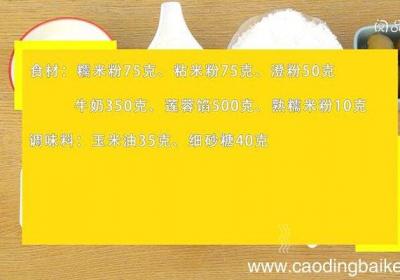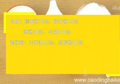 发布时间: 12小时前步骤1准备食材:糯米粉75克、粘米粉75克、澄粉50克、牛奶350克、玉米油35克、细砂糖40克 。步骤2盆中放入糯米粉、粘米粉、澄粉、细砂糖,搅拌均匀 。步骤3再少量多次倒入牛奶 。步骤4搅拌至无颗粒状 。步骤5再加入玉米油拌匀成稀面糊...