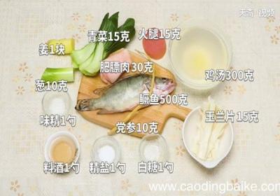 发布时间: 14小时前步骤1准备食材:鳜鱼500克、党参10克、肥膘肉30克、玉兰片15克、火腿15克、青菜15克、葱10克、姜1块、味精1勺、精盐1勺、白糖1勺、料酒1勺、鸡汤300克 。步骤2鱼身两面斜切一字刀备用 。步骤3将党参洗净,切成段 。步骤4肥膘肉...