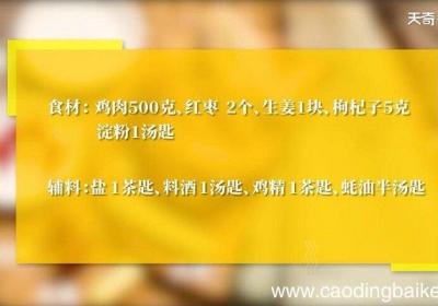 发布时间: 13小时前步骤1食材:鸡肉500克,大葱1段,红枣2个,生姜1块,枸杞子5克,淀粉1汤匙 。调料:盐1茶匙,料酒1汤匙,鸡精1茶匙,蚝油半汤匙 。步骤2生姜切片 。步骤3鸡肉洗净斩成小块 。步骤4红枣洗净去核切成丝 。步骤5鸡肉中放入红枣、枸杞、姜片...