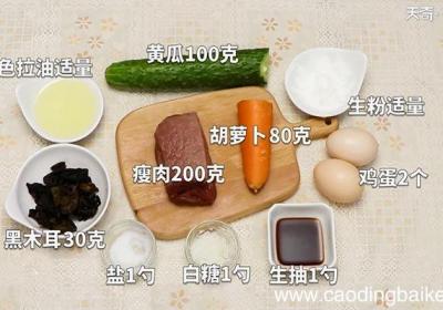 发布时间: 14小时前步骤1准备食材:鸡蛋2个、瘦肉200克、黄瓜100克、胡萝卜80克、黑木耳30克、色拉油适量、盐1勺、生粉适量、白糖1勺、生抽1勺 。步骤2瘦肉切成片 。步骤3胡萝卜切成菱形片 。步骤4木耳撕成小朵 。步骤5黄瓜切成片 。步骤6瘦肉片加盐、...