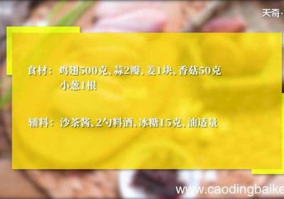 发布时间: 16小时前步骤1食材: 鸡翅500克、蒜2瓣、姜1块、香菇50克、小葱1根。辅料:沙茶酱、2勺料酒、冰糖15克、油适量 。步骤2鸡翅加入清水洗净,用叉子在表面戳洞,以便入味 。步骤3蒜切末 。步骤4姜切末 。步骤5香菇去蒂切厚片 。步骤6葱叶切丝 。...