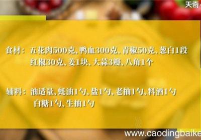 发布时间: 1天前步骤1食材: 五花肉500克、鸭血300克、青椒50克、葱白1段、红椒30克、姜1块、大蒜3瓣、八角1个 。辅料: 油适量、蚝油1勺、盐1勺、老抽1勺、料酒1勺、白糖1勺、生抽1勺 。步骤2五花肉切小块 。步骤3鸭血切小块 。步骤4青椒 红...