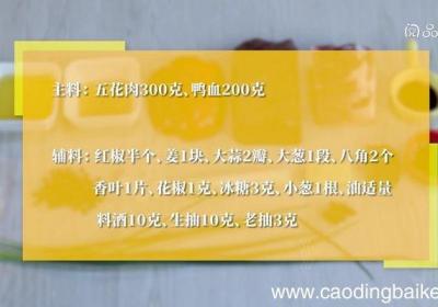 发布时间: 1天前步骤1准备食材:五花肉300克、鸭血200克、红椒半个、姜1块、大蒜2瓣、大葱1段、八角2个、香叶1片、花椒1克、冰糖3克、小葱1根、料酒10克、生抽10克、老抽3克 。步骤2鸭血切小方块 。步骤3红椒洗净切块 。步骤4姜切片 。步骤5蒜切...