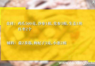 步骤1所需食材:鸡爪500克,沙参1根,党参3根,生姜1块,红枣2个 。所需调料:盐2茶匙、枸杞子3克,小葱2根 。【滋补鸡爪汤怎么做 滋补鸡爪汤的做法】步骤2鸡爪去指甲洗净,锅中水沸后,放入鸡爪、汆水5分钟捞出 。步骤3取炖锅,放入鸡爪、...