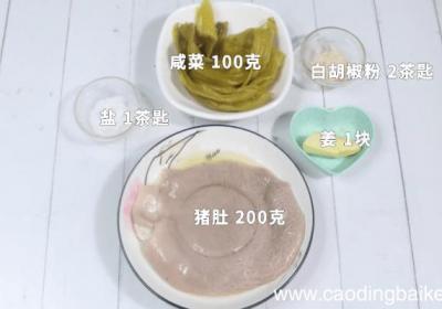 步骤1猪肚200克、咸菜100克、盐1茶匙、白胡椒粉2茶匙、姜1块 。步骤2咸菜洗干净切段备用 。【胡椒咸菜猪肚汤 胡椒咸菜猪肚汤的做法】步骤3猪肚洗净切丝备用 。步骤4姜切片备用 。步骤5锅中烧热水放入猪肚焯水2分钟捞出备用 。步骤6砂锅...