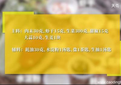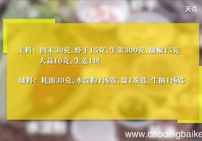 发布时间: 8小时前步骤1食材:肉末30克,虾干15克,生菜300克,耗油30克,甜椒15克,大蒜10克,生姜1块,生抽1汤匙,水淀粉1汤匙,盐1茶匙 。步骤2生菜洗净,清水烧开,放入生菜汆烫5秒钟,让菜的颜色保持鲜绿 。捞出装盘 。步骤3虾干泡水后切成小段...