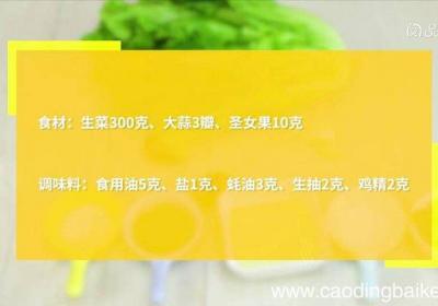发布时间: 8小时前步骤1食材:生菜300克、大蒜3瓣、圣女果10克 。调味料:食用油5克、盐1克、蚝油3克、生抽2克、鸡精2克 。步骤2生菜摘洗干净,放入沸水锅中焯烫10秒,捞出,摆入盘中 。步骤3大蒜切末 。步骤4圣女果对半切开 。步骤5炒锅中油温5成热时...