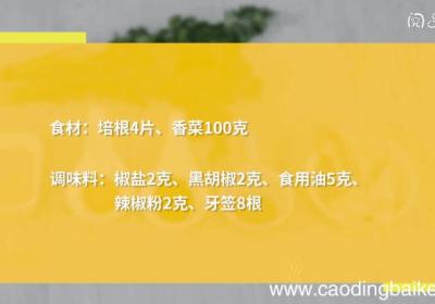 发布时间: 14小时前步骤1准备食材:培根4片、香菜100克、 椒盐2克、黑胡椒2克、食用油5克、辣椒粉2克、牙签8根 。步骤2培根片从中间切断 。步骤3香菜洗净、折成跟培根大小一致的长条 。【培根香菜卷的做法,培根香菜卷怎么做】步骤4将香菜卷入切好的培根片中、...