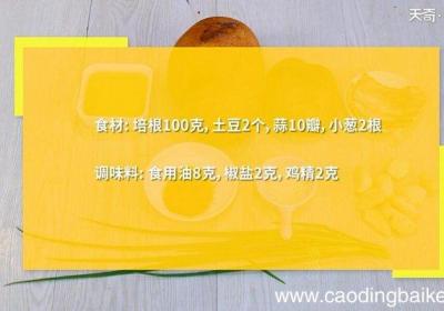 发布时间: 14小时前步骤1食材:培根100克,土豆2个,蒜10瓣,小葱2根 。调味料:食用油8克,椒盐2克,鸡精2克 。步骤2土豆去皮,切块 。步骤3蒜对半切开 。步骤4小葱切葱花 。步骤5培根对半切开 。步骤6热锅倒油,油温4成热时,下培根,煸炒出油,加蒜,...
