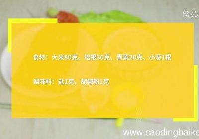 步骤1食材:大米80克、培根30克、青菜20克、小葱1根 。调味料:盐1克、胡椒粉1克 。步骤2培根切小片 。步骤3【培根粥的做法 培根粥怎么做】青菜切碎 。步骤4小葱切葱花 。步骤5锅中放入适量清水,放入大米煮至黏稠,加入培根煮5分钟 。...