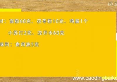 发布时间: 16小时前步骤1食材:面粉60克、茯苓粉10克、鸡蛋1个、小苏打2克、凉开水60克 。调味料:食用油5克 。步骤2.大碗中放入面粉、茯苓粉、鸡蛋、小苏打、凉开水 。步骤3拌匀成糊状 。步骤4锅中刷薄油 。步骤5油热后倒入适量面糊 。步骤6小火煎至两面...