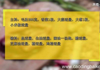 发布时间: 12小时前步骤1食材:毛肚300克,香菜1根,大蒜适量,大葱1根,小米椒适量 。调料:盐适量,生抽适量,辣油一汤匙,醋适量,芝麻油适量,糖适量,鸡精适量 。步骤2毛肚置锅中,加入适量水煮熟,步骤3大葱切丝 。步骤4煮好的毛肚切丝 。步骤5香菜切段 。...