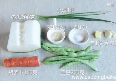 步骤1准备食材:冬瓜200克、芸豆200克、胡萝卜100克、姜1块、大蒜2瓣、小葱1根、盐1勺、鸡精1勺、食用油适量 。步骤2冬瓜洗净切条 。步骤3胡萝卜洗净切条 。步骤4芸豆摘去两头,掐成段,洗净备用 。步骤5姜切末,蒜切末,小葱切葱花...