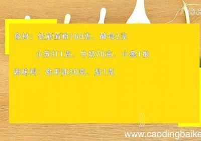 发布时间: 14小时前步骤1准备食材:低筋面粉160克、酵母2克、小苏打1克、牛奶70克、小葱1根、食用油30克、盐1克 。步骤2酵母用少许温水化开 。步骤3小葱切葱花 。步骤4面粉中加入酵母水、小苏打、牛奶、葱花、食用油、盐,揉成光滑面团 。步骤5静置醒发至2...