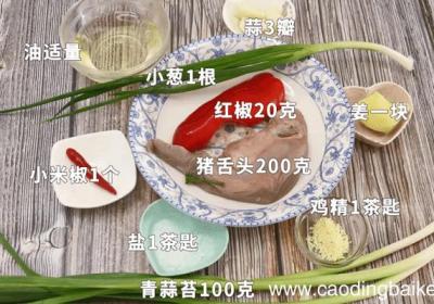 发布时间: 1天前步骤1准备食材:猪舌头200克、青蒜苔100克、小米椒1个、盐1茶匙、鸡精1茶匙、姜1块、红椒20克、蒜3瓣、油适量、小葱1根 。步骤2猪舌头洗净切片备用 。步骤3蒜切末 。步骤4姜切末 。步骤5小葱切葱花 。步骤6红椒切段 。步骤7小米椒...