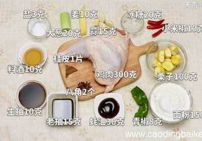 步骤1准备食材:鸡肉300克、栗子100克、面粉150克、生抽10克、老抽15克、盐3克、蚝油30克、料酒10克、蒜15克、大葱20克、姜10克、八角2个、桂皮1片、小米椒10克、青椒8克、冰糖20克 。步骤2葱切段 。步骤3蒜切片 。步骤...